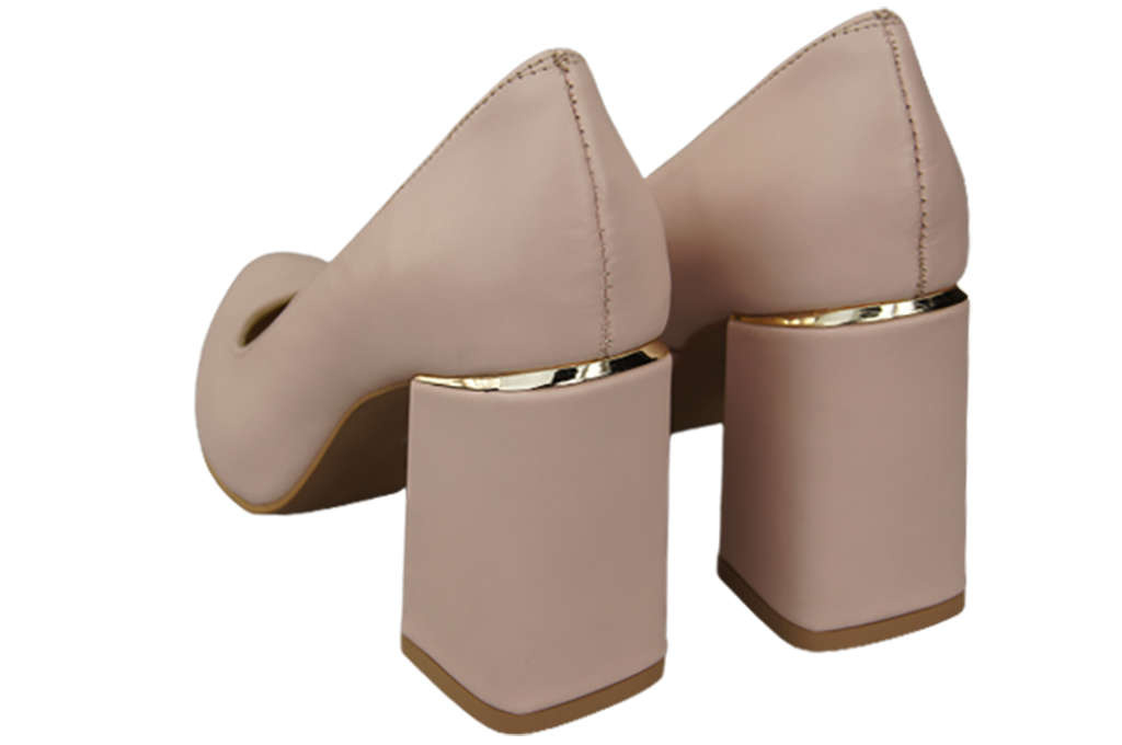 - Vzhled doplňuje široký kožený podpatek se zlatou vložkou.